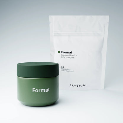 Format is the first and only formulation for immune aging that combines a daily immune supplement that provides foundational immunity ingredients and Elysium’s Inflammaging Complex with Elysium’s intermittent Senolytic Complex. Format addresses both the root causes and the downstream effects of an aging immune system.