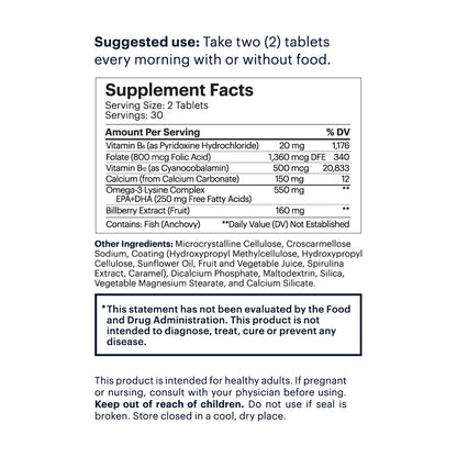 Matter is designed to support long-term brain health with a specific combination of B-vitamins (B6, folic acid and B12) that was shown in a clinical study to slow age-related brain atrophy associated with mild memory concerns, omega-3s, and a bilberry extract that is rich in plant-based antioxidants called anthocyanins. All of these ingredients have been shown, through a combination of epidemiological research and clinical trials, to support brain function.The B-vitamin complex plays an important role in maintaining normal metabolism of the amino acid homocysteine. High homocysteine levels are associated with advanced age and have been shown to correlate with the rate of brain atrophy in healthy adults. In the University of Oxford's VITACOG study, two-year supplementation with the B-vitamin complex was shown to effectively lower homocysteine levels and slow age-related brain atrophy in 168 older people with mild memory concerns. Other studies of shorter duration have indicated that the effect of B vitamin supplementation on homocysteine levels occurs in the order of a few months.