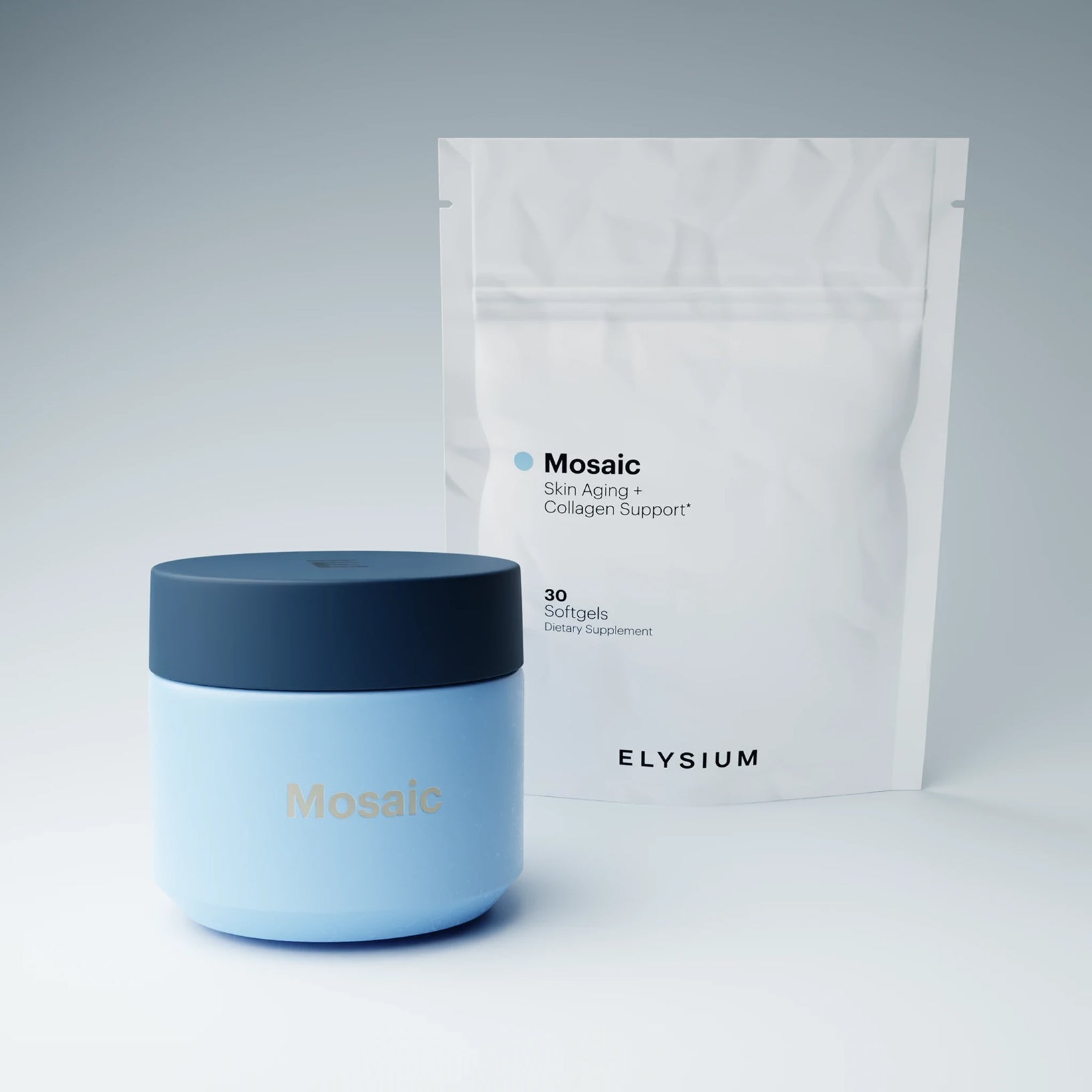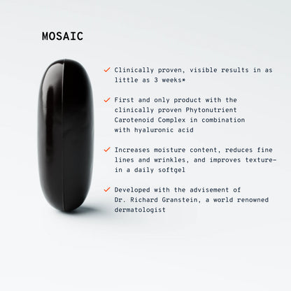Mosaic is a breakthrough skin care supplement developed by Elysium Health with the advisement of Dr. Richard Granstein, chair of the Department of Dermatology at Weill Cornell Medicine for nearly 30 years and one of the world’s foremost experts in dermatology. Mosaic features the unique, clinically proven Phytonutrient Carotenoid Complex, which helps to develop a “foundation” for the ideal cellular environment to counter key stressors that drive skin aging. In a single daily softgel, Mosaic combats skin aging from the innermost layers for visibly healthy, youthful skin.