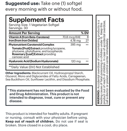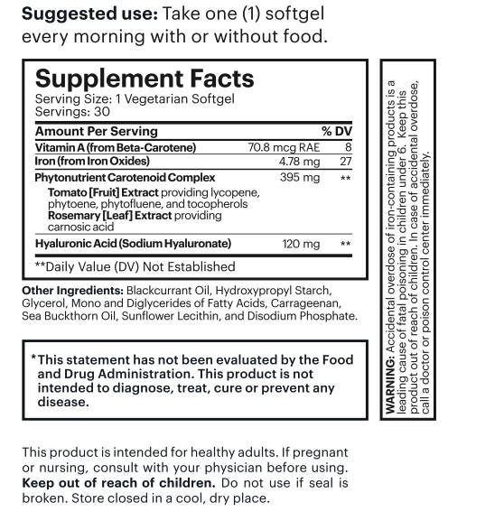 - First and only product with the clinically proven Phytonutrient Carotenoid Complex in combination with hyaluronic acid